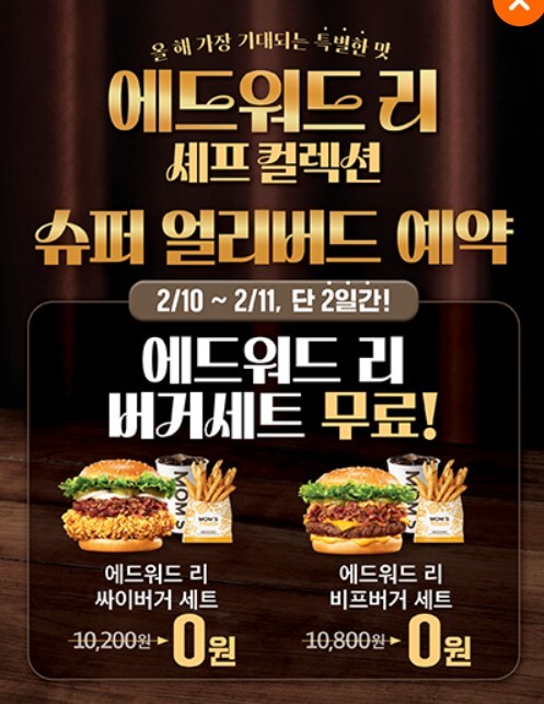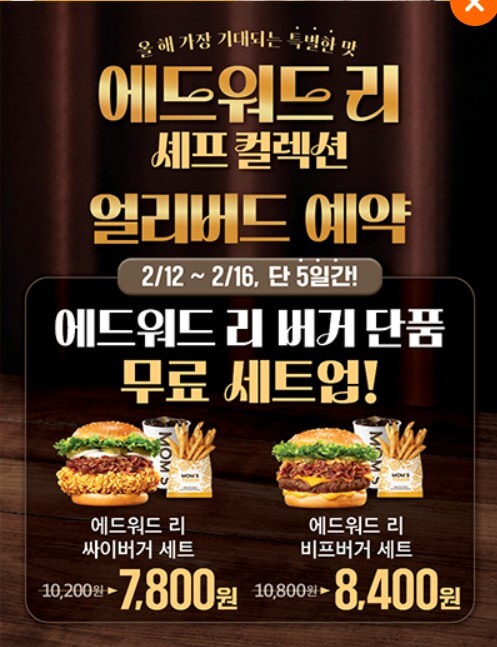 슈퍼 얼리버드 예약은 2월 10일부터 11일 단 2일간 에드워드 리 버거세트를 무료로 맛보실 수 있고, 얼리버드 예약은 2월 12일부터 16일까지 5일간 무료로 버거 세트업을 해준다고 하니 빠르게 예약하시기 바랍니다.